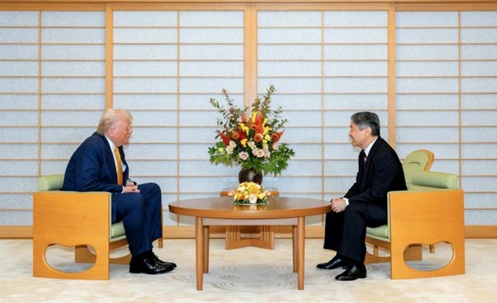 Președintele american Donald Trump a fost primit cu fast de împăratul Naruhito al Japoniei, într-o ceremonie plină de onoruri. Aceasta vizită marchează prima întâlnire a lui Trump cu noul împărat, dup...pescurt.ro Oct 28, 2025