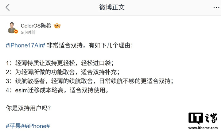 Chen Xi, directorul de design al OPPO ColorOS, a comentat despre iPhone Air, subliniind că acesta este foarte potrivit pentru utilizarea duală. Motivul principal este greutatea sa redusă și dimensiuni...pescurt.ro Sep 10, 2025